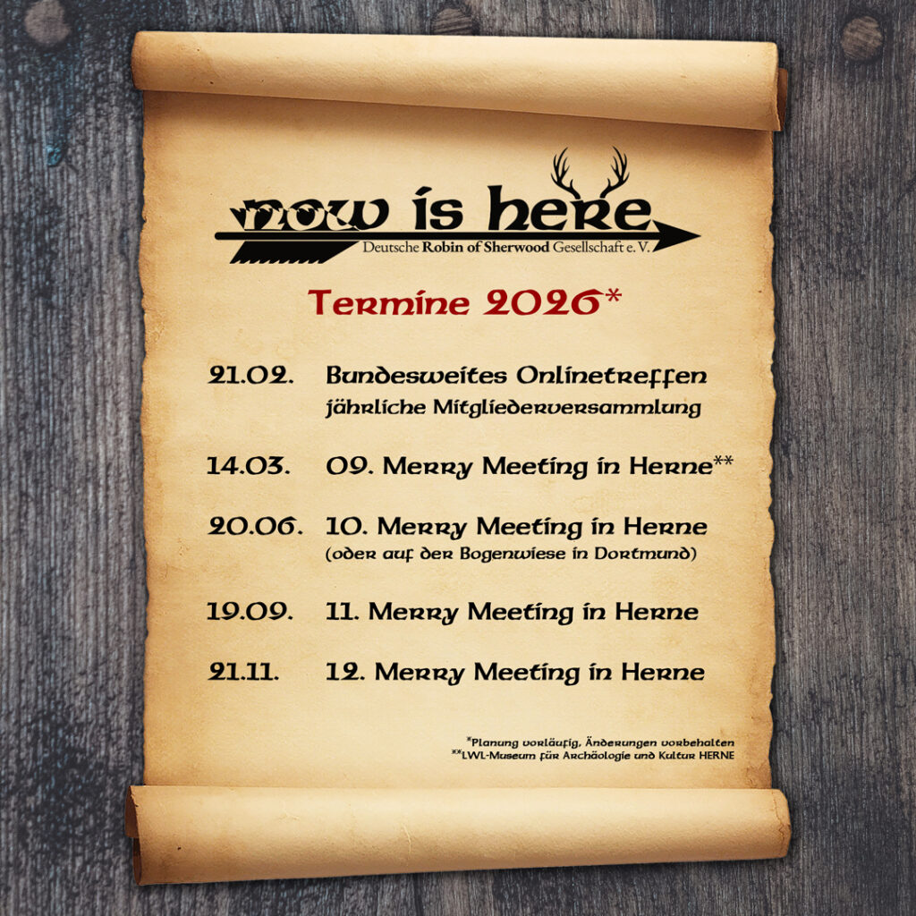 Jedes Jahr findet ein Onlinetreffen statt, im Februar oder Anfang März. Außerdem gibt es vier Merry Meetings in Präsenz in Herne – die Daten legen wir so, dass sie in der Nähe der Jahreskreisfeste (Sonnenwenden und Tagundnachtgleichen) liegen und sich möglichst wenig mit anderen interessanten Veranstaltungen oder Ferienzeiten überschneiden.